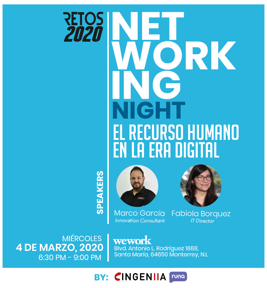 Se parte de nuestro NETWORKING NIGHT el próximo miércoles 4 de Marzo del 2020 en las instalaciones de WEWORK donde podrás interactuar, conectar y tomarte unos drinks en donde hablaremos acerca de las nuevas generaciones de negocio que utilizan a favor los diferentes medios digitales.